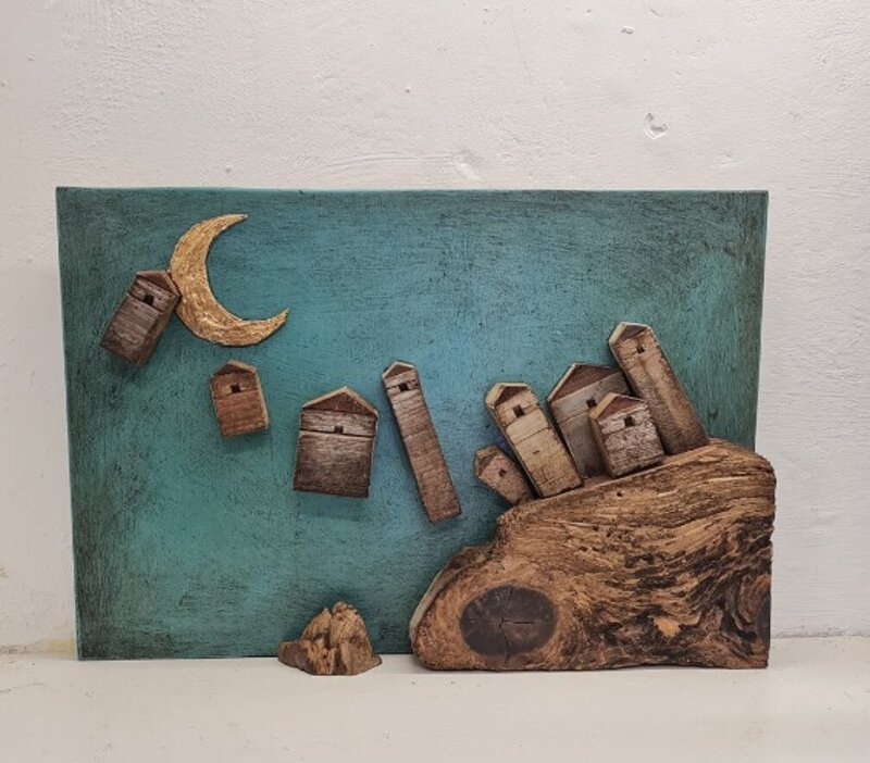 Paesino tridimensionale realizzato interamente a mano con legno di recupero Cm 20x29Hand made art cm 20x29