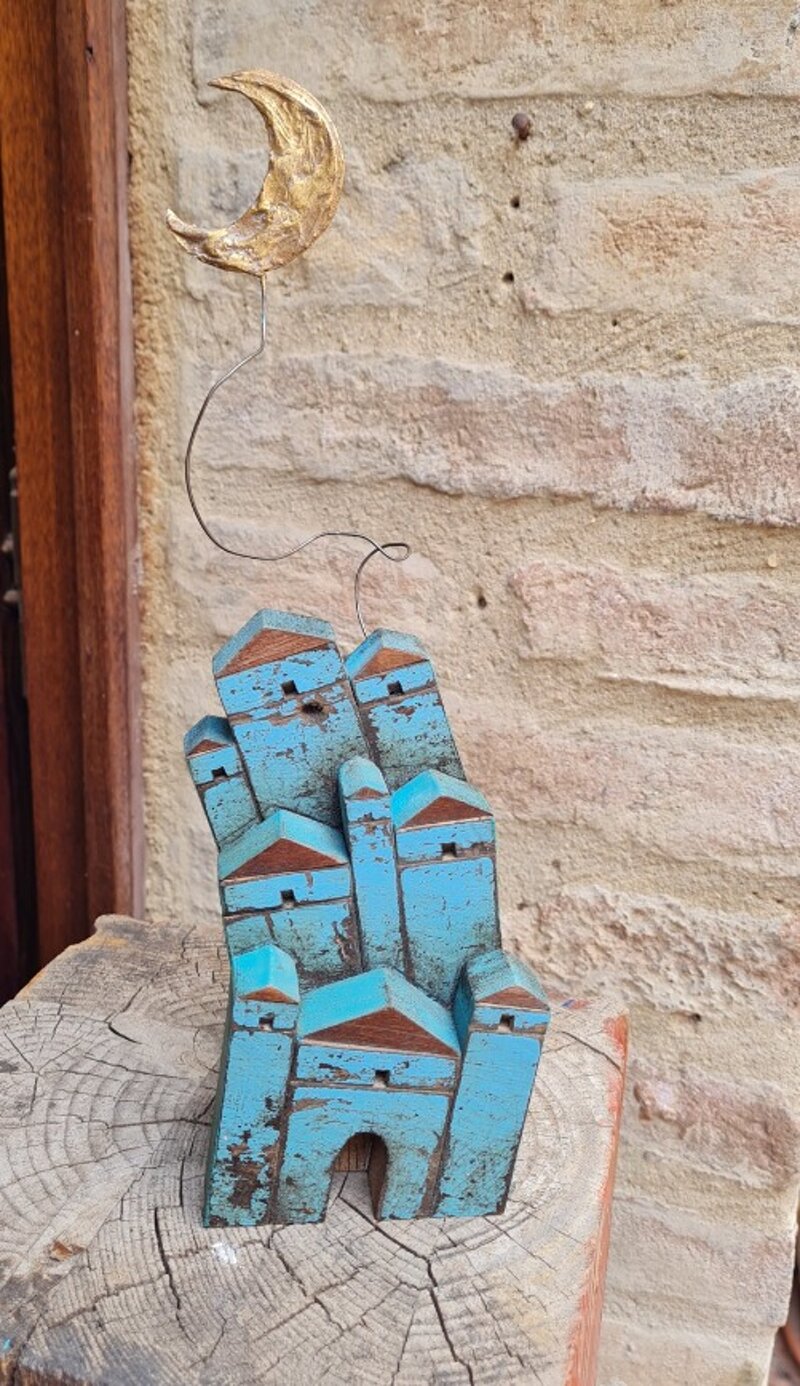 Quest’opera è stata realizzata interamente a mano utilizzando legno di recupero, un materiale che porta con sé i segni della sua storia e del tempo. Ogni elemento è stato lavorato singolarmente per creare questo piccolo paese immaginario che si sviluppa verso l’alto, quasi a cercare la luce della luna.