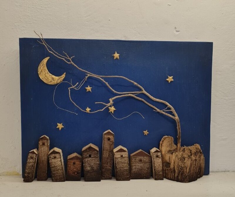 Paesino tridimensionale realizzato interamente a mano con legno di recupero Dimensione cm 40x27Hand made wood art cm 20,5x29