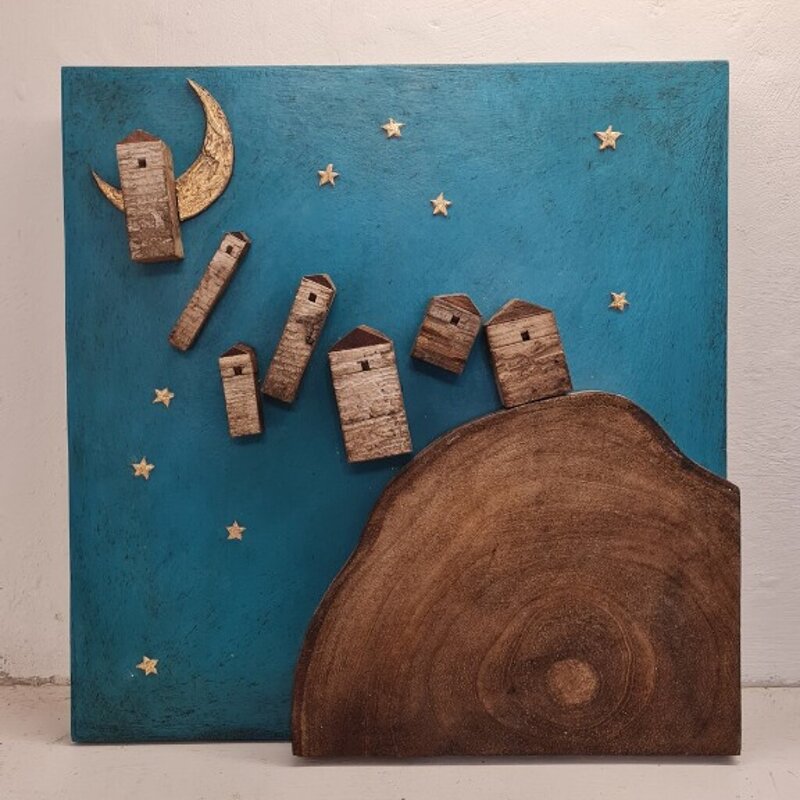 Un piccolo paese si raccoglie sotto il cielo della notte, come se respirasse all’unisono con le stelle, tutto pare muoversi senza fretta: i tetti inclinati, le ombre morbide