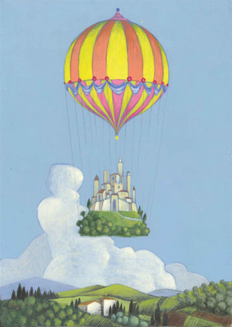 molto lontano, un piccolo paese dove tutti vivevano felici e contenti, tutti si amavano e si aiutavano l'un con l'altro. Un giorno però la tranquillità di questo popolo fu spezzata dall'arrivo di due giganti così arroganti che tutta la popolazione decise di partire per un'altra terra. Ma era così difficile abbandonare le proprie case, che venne loro una bellissima idea: costruire una gigantesca mongolfiera dove poter trasportare l'intero paese. E così fu che, approfittando di un momento di debolezza dei due giganti, caricarono tutto e partirono, volando talmente lontano che nessuno riuscì più a trovarli. Sarebbe così bello, ogni volta che si presenta un problema, poter partire e fuggire lontano da qualsiasi preoccupazione! Purtroppo questo non è sempre possibile, ma nei nostri sogni, nella nostra immaginazione non ci sono limiti, e questi disegni hanno il potere di farci, per un momento, sognare.