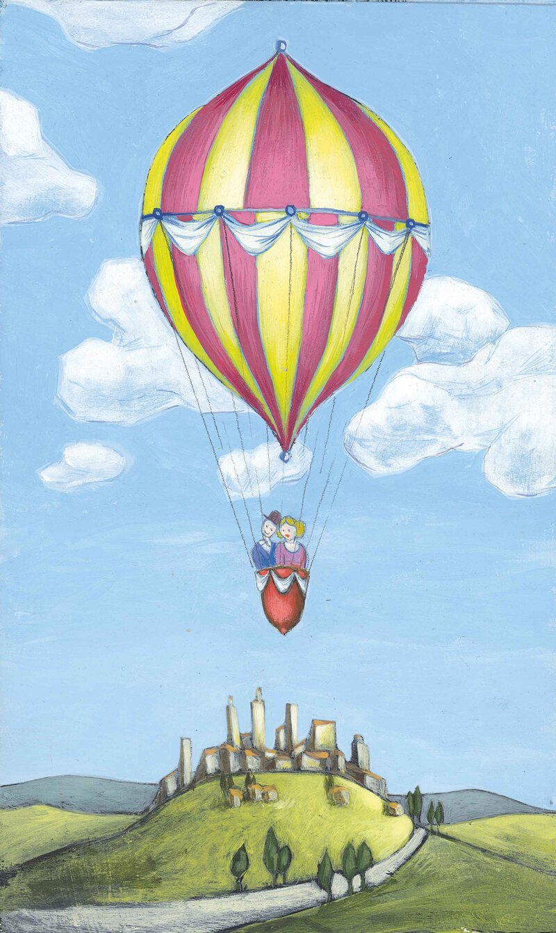 C'era una volta in un paese molto lontano una bellissima fanciulla che si chiamava Isadora.Ella desiderava tanto poter volare, e poter osservare il mondo dall'alto. Un giorno conobbe Teodolindo, un artigiano dalle mani d'oro, che era capace di costruire delle meravigliose mongolfiere. Isadora non aveva mai visto una mongolfiera e, quando Teodolindo gliela mostrò, la fanciulla rimase a bocca aperta. Tra Isadora e Teodolindo sboccio' subito l'amore e , a dimostrazione di ciò che lui provava per questa splendida fanciulla, costruì una mongolfiera, tutta colorata di giallo e di rosso, e chiese a Isadora di partire con lei per un lungo viaggio.E partirono... come Isadora aveva sempre sognato, e viaggiarono insieme per il resto della loro vita. Chi non ha mai sognato una volta nella vita di fare un viaggio d'amore come questi due personaggi? Questa è una bellissima storia ma se ne potrebbero immaginare tante altre con questi bellissimi disegni.