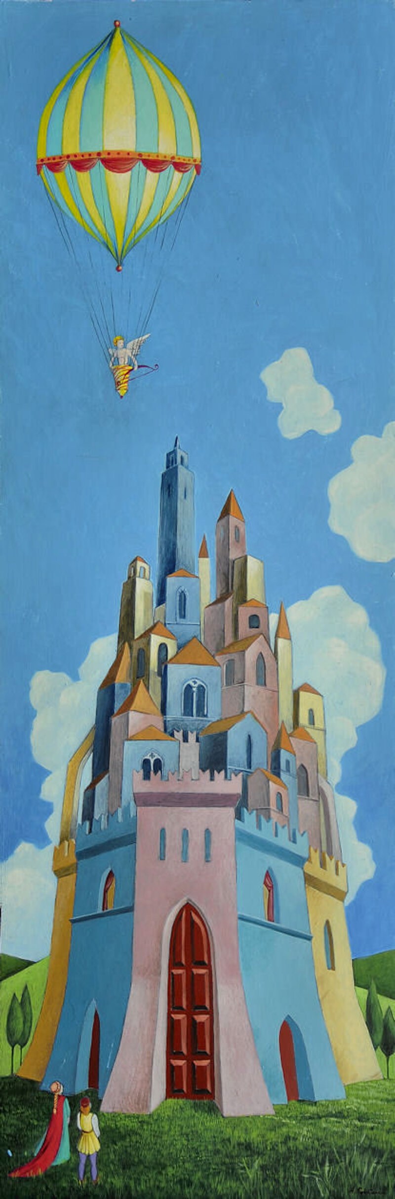 Due innamorati, un castello, il Dio dell'amore che arriva in mongolfiera: