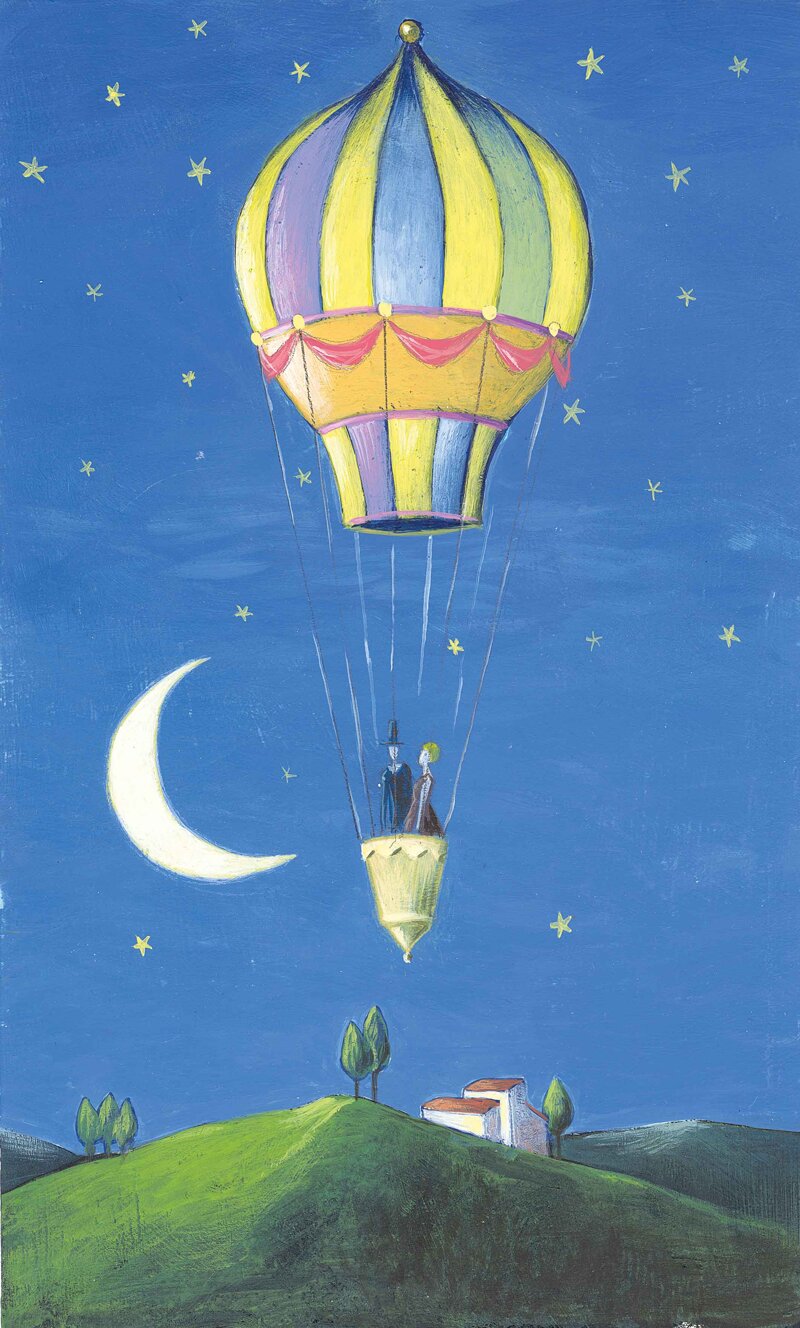 La Luna che brilla, una mongolfiera vola silenziosa nel cielo, a bordo ci sono due innamorati
