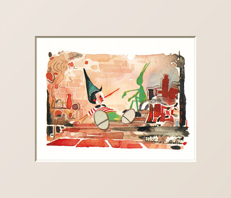 DIMENSIONE CM 26X30La fantasia di questo pittore non ha limiti nel rappresentare questa deliziosa favola che ancora oggi riesce ad incantare grandi e piccini. Questi acquerelli, dai colori così delicati, ci raccontano le avventure di questo famoso burattino catapultandoci in una girandola di avventure.