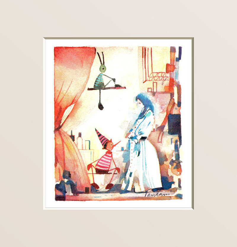 Che immagine dolcissima in questo bellissimo acquerello, dove Pinocchio guarda la Fata Turchina nello stesso modo in cui un bambino osserva incantato la propria mamma.Questo pittore ha un tocco magico e sicuramente un cuore gentile per arrivare a realizzare dei così teneri disegni