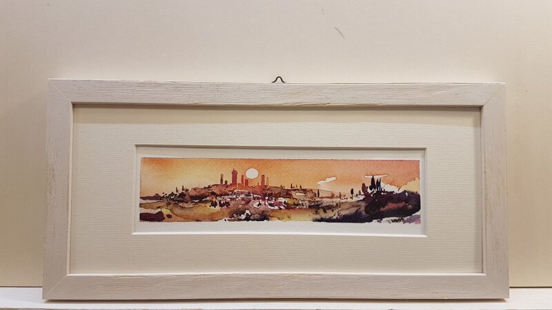 I toni caldi, e i colori tenui, avvolgono come in una cornice il panorama di San Gimignano, con le sue torri e la sua atmosfera d'altri tempi.