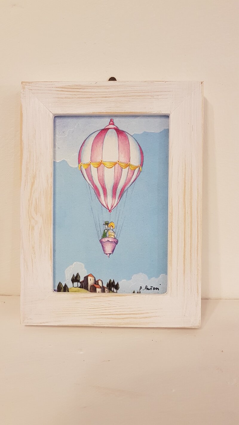 Stampa con cornice in legno sbiancato dimensione complessiva cm 12x17 Hot air balloons print with wooden frame size cm 12x17